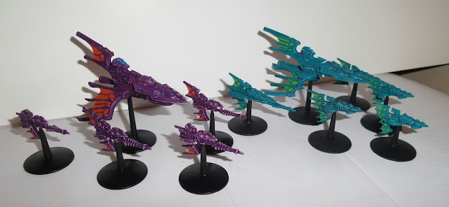 Secondly, Ive had a bit of a paint of some of my Ork small escort type ships. So far I have finished three, ignore the bases as not done those yet, but i have the basic colours done and details started which will be finished today, a day off so im making it a painting and walking day.